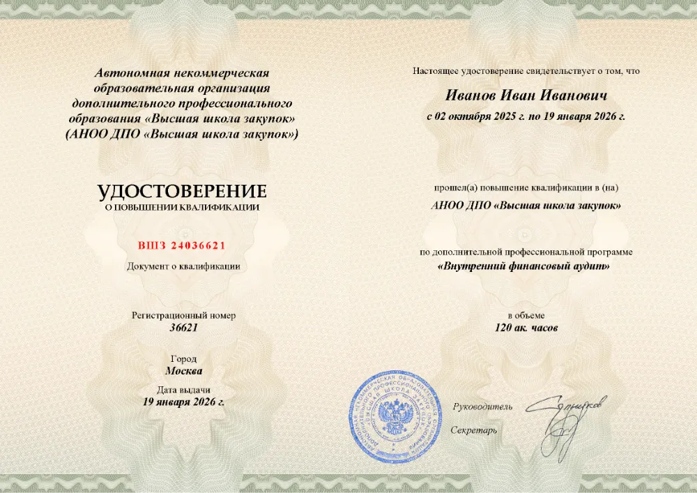 Повышение квалификации, 120 академических часов, 8 модулей: правовое регулирование и основы внутреннего финансового аудита, планирование и методика аудиторской проверки, выявление нецелевого использования средств и реализация результатов аудита. Онлайн-обучение в в Челябинске с итоговой аттестацией.