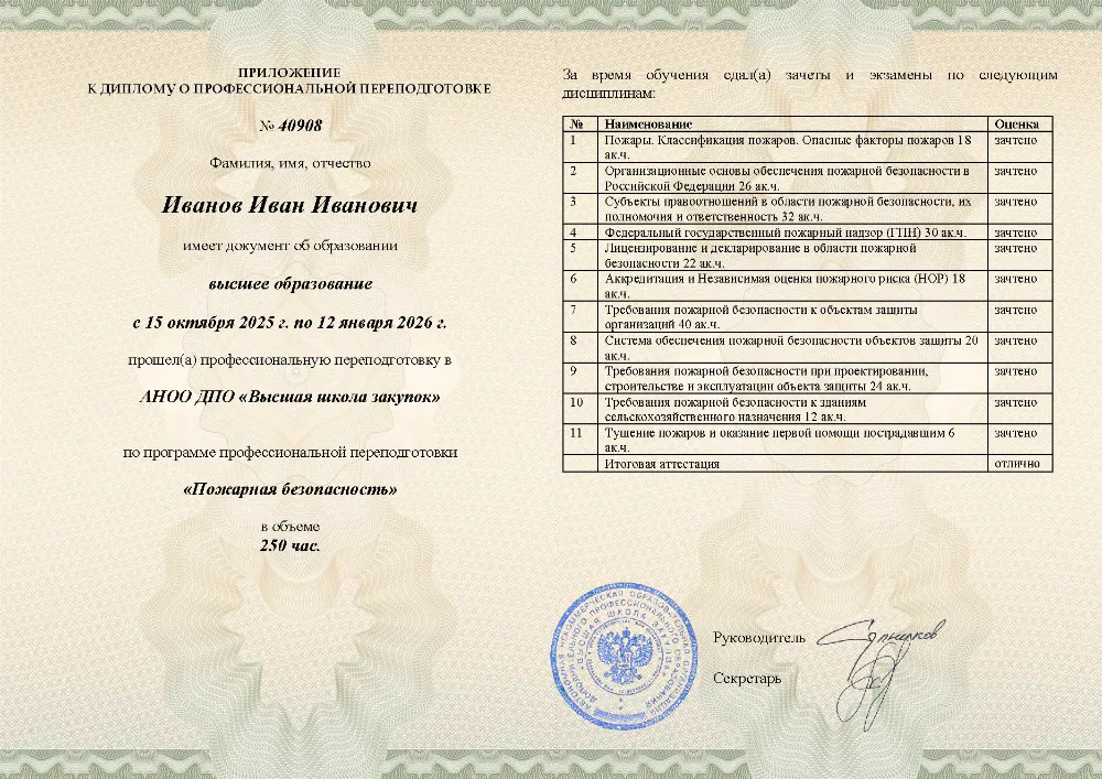 Профессиональная переподготовка, 250 академических часов, 11 модулей: организационные основы и законодательство в области пожарной безопасности, лицензирование и надзор, требования к объектам защиты, проектирование, тушение пожаров и оказание первой помощи пострадавшим. Онлайн-обучение в в Челябинске с итоговой аттестацией.