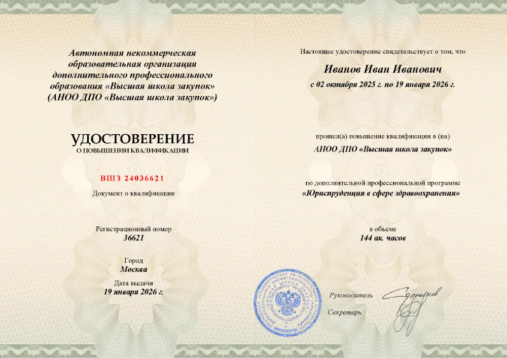 Повышение квалификации, 144 академических часа, 12 модулей: основы государственного, гражданского и административного права, трудовое и налоговое право, правовые основы охраны здоровья, права граждан и медицинских работников, юридическая ответственность в медицине. Онлайн-обучение в в Челябинске с итоговой аттестацией.